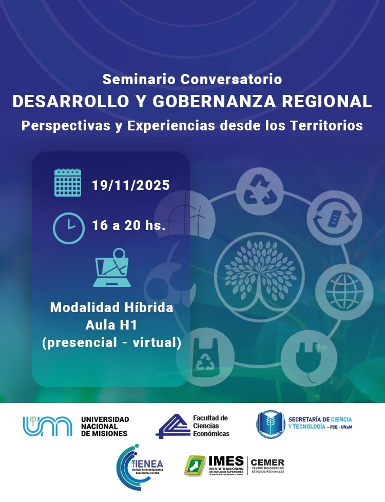 La Facultad de Ciencias Económicas de la Universidad Nacional de Misiones (FCE–UNaM) invita a participar del Seminario–Conversatorio “Desarrollo y Gobernanza Regional: Perspectivas y experiencias desde los territorios”, que se llevará a cabo el martes 19 de noviembre, de 16 a 20 horas, en el Aula H1 de la Facultad, bajo modalidad híbrida (presencial y virtual).